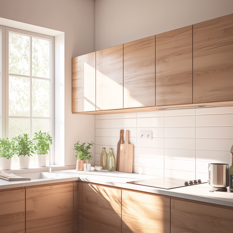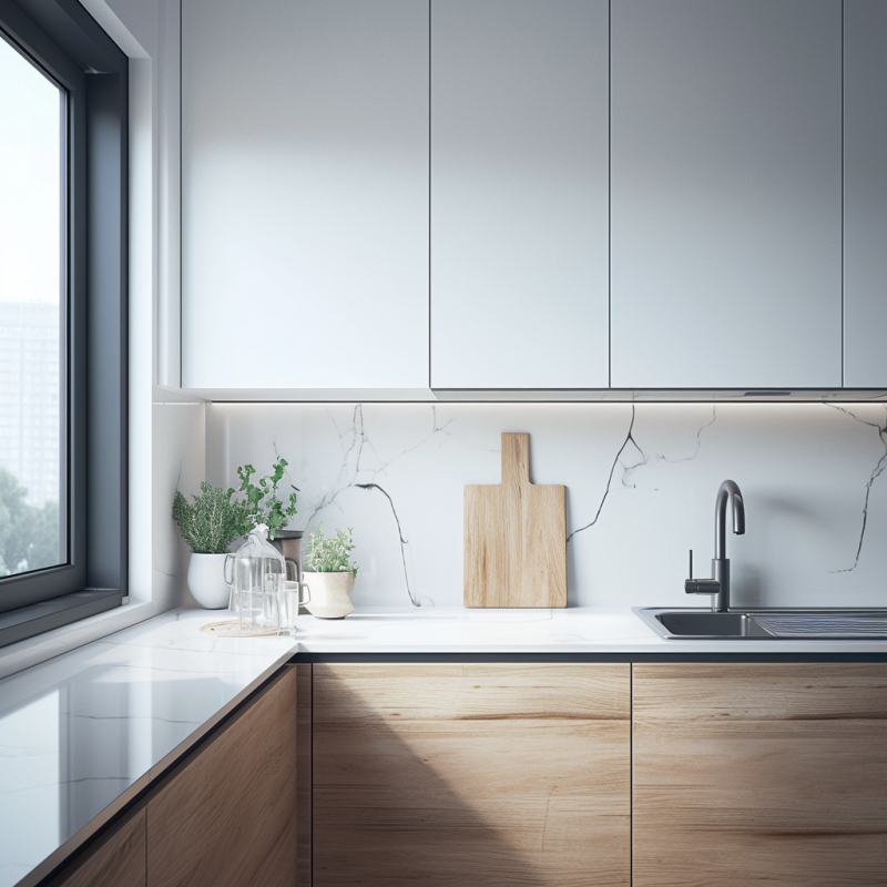 Crafted from solid wood, the kitchen bears the hallmark of nature’s finest. It’s a testament to years of nature’s nurturing, resulting in a product that embodies grace and endurance. The countertop, a sheet of transparent quartz, refracts ambient light in ways that animate the space, giving life to its intrinsic natural patterns.