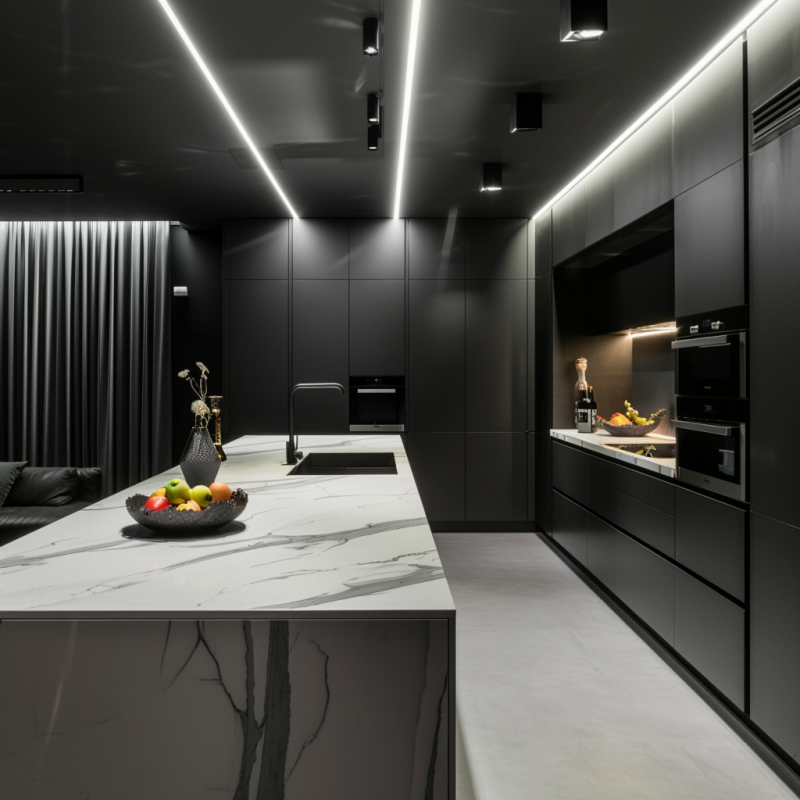 The dominant black hue brings sophistication and depth, setting a dramatic yet elegant tone. The crisp contrast of the pristine countertop against the deep black creates an ambience of refined modernity. The interplay of matte and shine, achieved through strategic lighting, amplifies the allure of the black, making it both functional and fashionable.