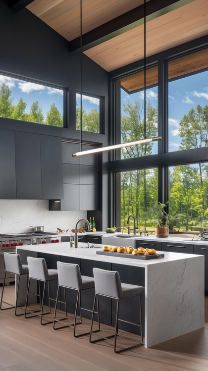 The kitchen is a symphony of functionality and design. With its U-shaped counter layout, it promises ample space for both cooking and dining. The mix of open shelves and closed cabinets offers versatile storage solutions, ensuring every utensil and appliance has its designated spot. The integration of light fixtures and the choice of material create a space that’s as inviting as it is functional, resonating with those who seek both style and practicality in their kitchen space.